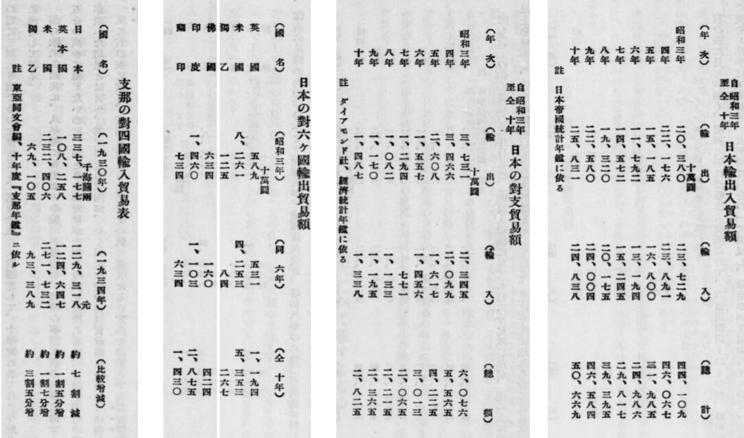 右から二番目の表は中国との貿易額の推移だが、この数字は昭和七年まで下落を続け、その後はほとんど伸びず、昭和十年の輸出額は昭和三年の四割にも満たない水準である。同書には次のように解説されている。