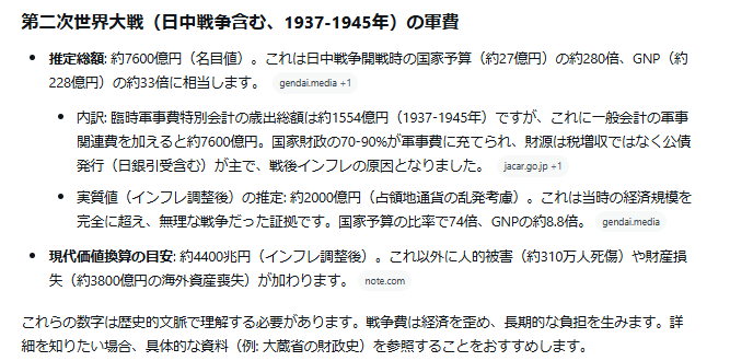 その後も様々な武器や装置が開発されてさらに軍事費は膨らんでいったのだが、第二次世界大戦(日中戦争含む)でわが国がどの程度の軍事費を使ったかをGrokに聞くと「推定総額: 約7600億円(名目値)。これは日中戦争開戦時の国家予算(約27億円)の約280倍、GNP(約228億円)の約33倍に相当します。」「現代価値換算の目安: 約4400兆円(インフレ調整後)」との回答があった。