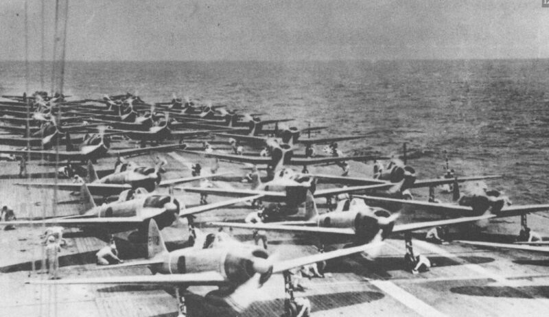 いずこからともなく姿をあらわした一群の雷撃機が、ホノルルの方角から突入してきたと見る間に、真珠湾の静かな海面に、低く、すばらしい速度で迫ってきた。軍艦に近づくと、かれらは、一段と高度を下げ、まず猛然と魚雷をぶッ放した。魚雷は、陽光に白魚のように輝き、水煙を立てて水中に沒入した。