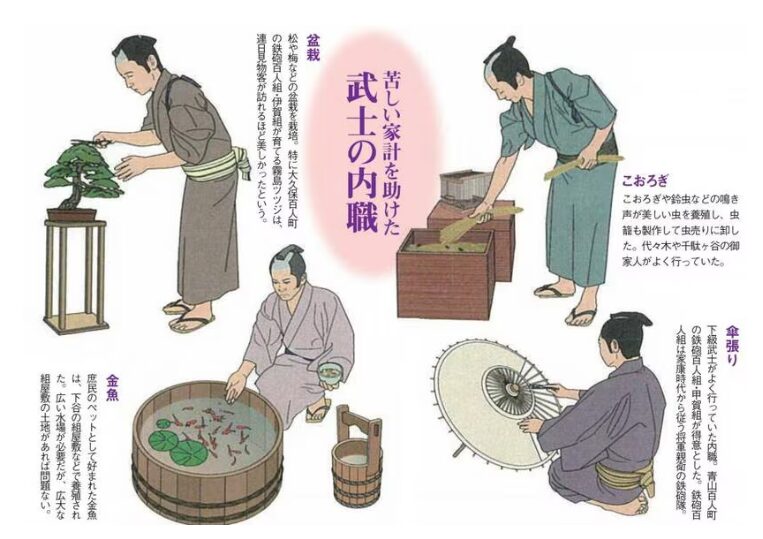 『甲子夜話』に武士の内職仕事として「米澤の筆、鍋島の竹子笠、秋月の印籠、小倉の合羽の装束」が紹介されていたが、小田原提灯や大和郡山の金魚、山形天童市の将棋の駒なども有名なところで、幕府の旗本や御家人も、下谷の金魚、御徒町の朝顔、牛込の提灯などの稼ぎで苦しい生活をやりくりしていた。