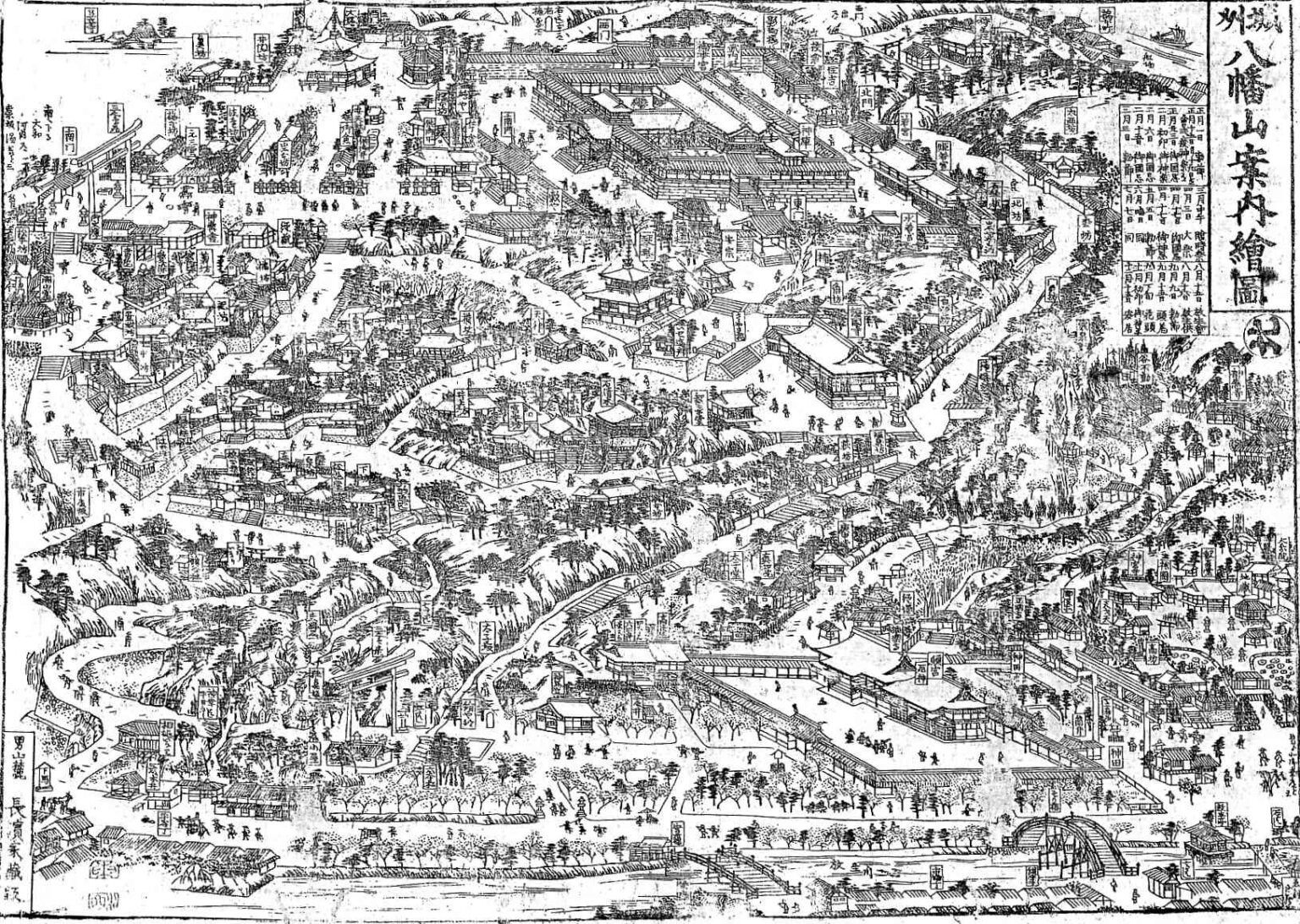 上の画像は慶応三年(1867年)に製作された『城州八幡山案内絵図』で、大きな屋根が描かれている建物は、上から石清水八幡宮の本社、護国寺、極楽寺・頓宮である。