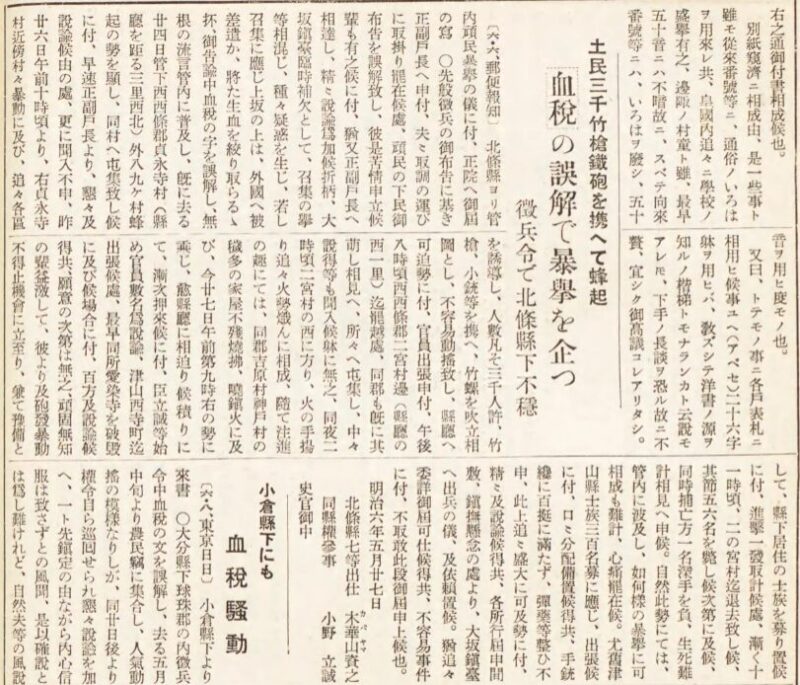 この話は実際にあった話であり、『新聞集成明治編年史 第二卷』で当時の報道記事を確認することが出来る。「北條県」というのは現在の岡山県東北部に存在した県で、この記事によると三千人ばかりが竹槍や小銃を携えて蜂起し、吉原村、神戸村の家屋が焼かれたようだ。