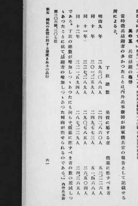 当時徴兵忌避者が如何に多かったかは、亘理章三郎著の前掲書に出ている内外兵事新聞の統計データを見ればわかる。兵役を免れた割合が八割~九割が忌避していたという数字には驚いてしまった。