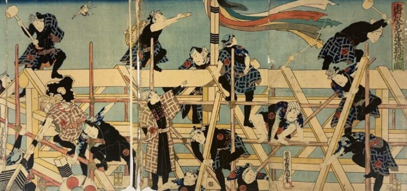 歌川国貞「大工 市村座見立建前祝ノ図 三枚続」