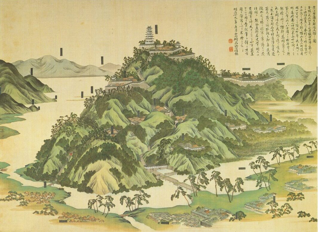 上の図は大阪城天守閣所蔵の「安土城図」で、当時は琵琶湖に接していたのだが、昭和期に周囲が干拓されたために、湖岸から離れた位置に安土城址が残っていて国の特別史跡になっている。