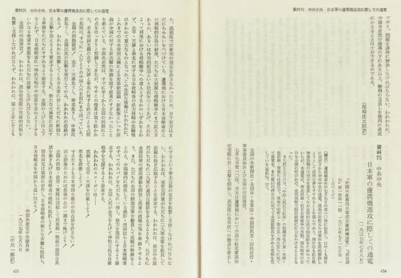 他の資料を探していると、日本側に中国共産党宛の電信が傍受されていたことが平成六年九月八日付の産経新聞の夕刊に報じられていることがわかった。その後中国共産党は発砲事件の翌日八日に、延安から蒋介石、宋哲元や新聞社、国民政府関係、軍隊などに長文の電報(『78通電』)を発信している。この長文の電報の訳文は勁草書房の『中国共産党史資料集 第8巻』の資料75に掲載されている。