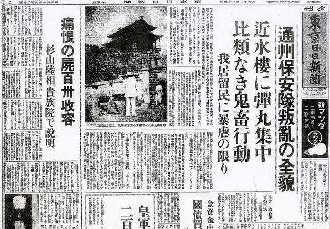ところが、翌七月二十九日に通州で、中国保安隊による大規模な日本人虐殺事件(「通州事件」)が発生している。この「通州事件」を記述する歴史書は戦後の出版物では極めて少なく、新聞やテレビなどで解説されることは戦後では皆無に近い。しかし、当時の新聞や雑誌などではその惨状が大きく報道され、日本人の被害が克明に記録されており、証拠となる写真も多数残されている。