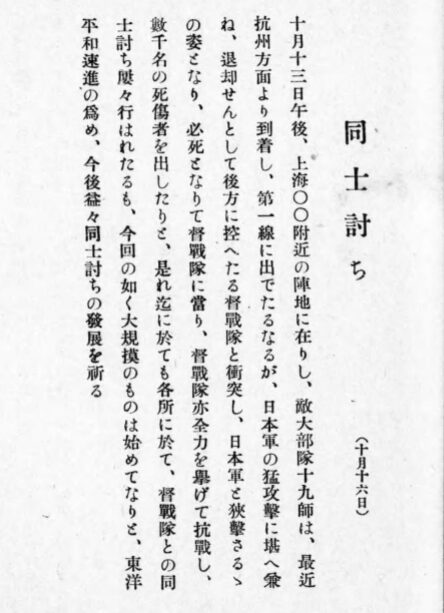 Wikipediaに紹介されているのは昭和十二年の十月十三日の中国兵の同士討ちに関する『東京朝日新聞』の記事であるが、同じ日の同じ場所の兵士の目撃記録は『支那事変血染の花籠』という本にも出ている。Wikipediaには新聞記事の内容が紹介されている。