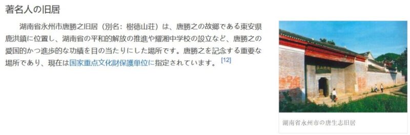 さらに唐生智の故郷・湖南省永州市にある彼の旧居(樹徳山荘)は「国家重点文化財保護単位」に指定されている。なぜ唐生智が中国の英雄のように扱われているのか、多くの日本人が疑問に思うに違いない。