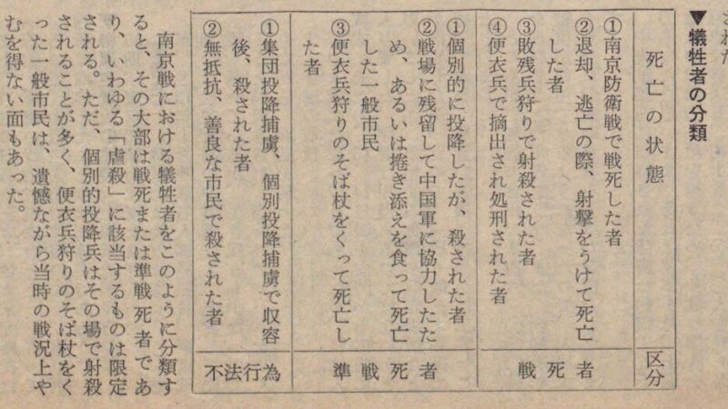 『偕行 : 陸修偕行社機関誌 (410)』所収の『証言による南京戦史11』に畝本正巳が犠牲者の分類をしておられるが、現場に残された中国人の死体は、戦死者か、準戦死者が大部分で、さらに中国軍督戦隊との同仕打ちや混乱で生じた死者がかなりあった。もし日本軍による「虐殺行為」があったとして批難されるケースは、捕虜の殺害と無抵抗、善良な市民を殺害した場合に限定される。