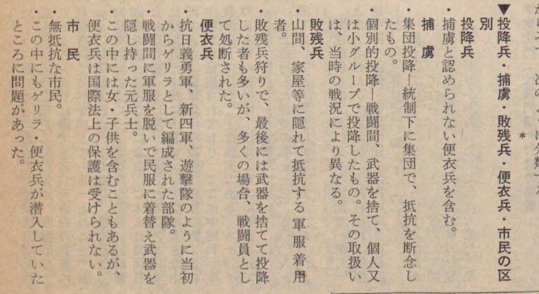 畝本正巳が参戦者の証言から投降兵、捕虜、敗残兵、便衣兵、市民を分類しておられるが、「捕虜」は、「統制下に集団で、抵抗を断念したもの」が中心で、個別的投降兵は戦況により異なるが、その場で射殺されることが多かったようだ。また「市民」の中にもゲリラ・便衣兵が潜入していることもあったという。