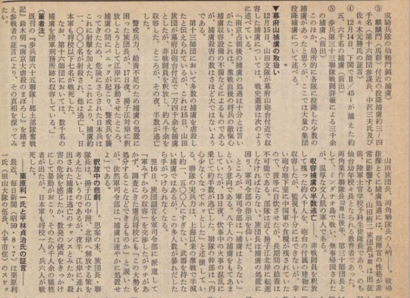 中国兵捕虜は日本兵よりもはるかに多く、その扱いに日本軍は苦慮しており、監視が行き届かないために収容していた捕虜の半数が逃亡するようなことがあったという。それでも数が多いので揚子江北岸に行って捕虜を釈放しようと決し江岸に連れ出したのだが、このタイミングを捕虜が逃亡するチャンスとみたのかあるいは処刑される危険を感じたのか、数発の銃声をきっかけに暴れ出し、そのために捕虜千人余が犠牲となり、日本軍も将校一人、兵六人が戦死した事件があったことが『証言による南京戦史11』に記録されている。こんな事件も中国からすれば「日本軍による大虐殺」に分類されるのかもしれないが、中国の捕虜が暴れたために起こった事件であるならば、日本側の不法行為になるとは考えにくい、