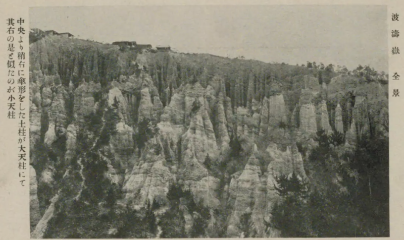 土柱層がむき出しになってるあたりを「波濤嶽」と呼び、昭和九年に国の天然記念物に指定されている。現地のパンフレットには次のように解説されている。