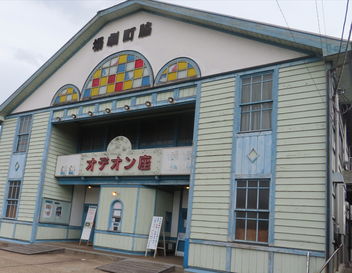 この建物は昭和九年(1934年)に芝居小屋として建てられ、第二次世界大戦後は歌謡ショーや映画上映など娯楽の殿堂として親しまれてきたが、映画産業の衰退や老朽化などが理由で閉館となり、平成七年(1995年)には取り壊される予定であった。ところが平成八年(1996年)に山田洋二監督、西田敏行主演の松竹映画『虹をつかむ男』のロケ地となり、作品の中で「オデオン座」として登場したことが契機となって建物が保存されることとなる。ちなみに「オデオン座」というのはフランス・パリの国立劇場の名前である。