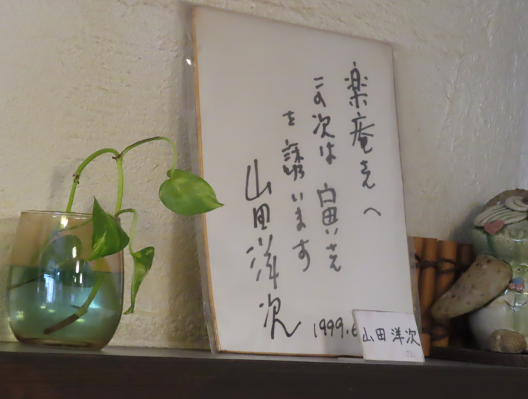 昼食はオデオン座の隣の楽庵で撮ったのだが、カウンターの奥の壁に山田洋二監督のサイン入り色紙があり1999年6月の日付で「この次は寅さんを誘います」と書かれているのを見て驚いた。オデオン座に残されていた山田監督の色紙には日付不明だったが「オデオン座よ永遠に」と書かれていて、おそらくロケの時に記されたものであろう。
