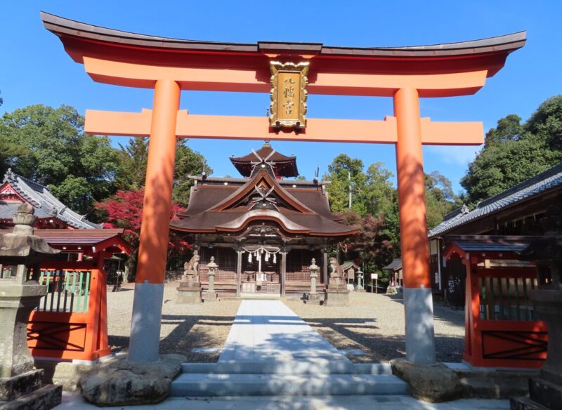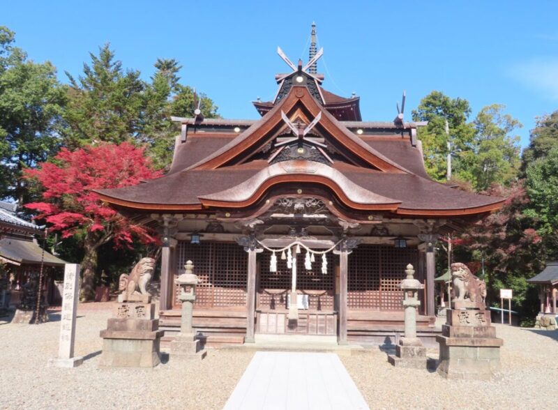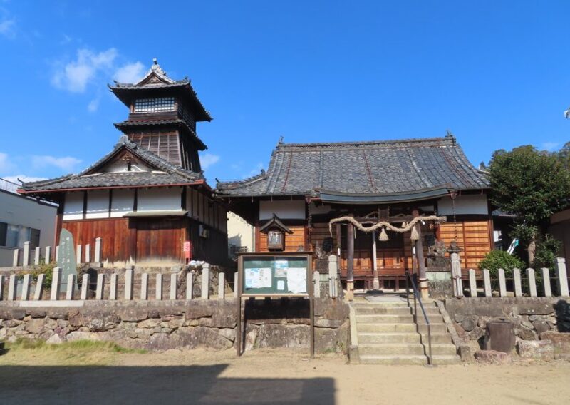 この神社の魅力は何と言っても素晴らしい三重塔(県指定文化財)。ここでは神社の象徴的建造物である鳥居や本殿の背後に、仏教の象徴的建造物である三重塔が聳えるという、珍しい光景を見ることが出来る。また、塔の前にある鐘楼の鐘は、前述した通り、もとは高山寺にあったもので兵庫県指定重要文化財である。